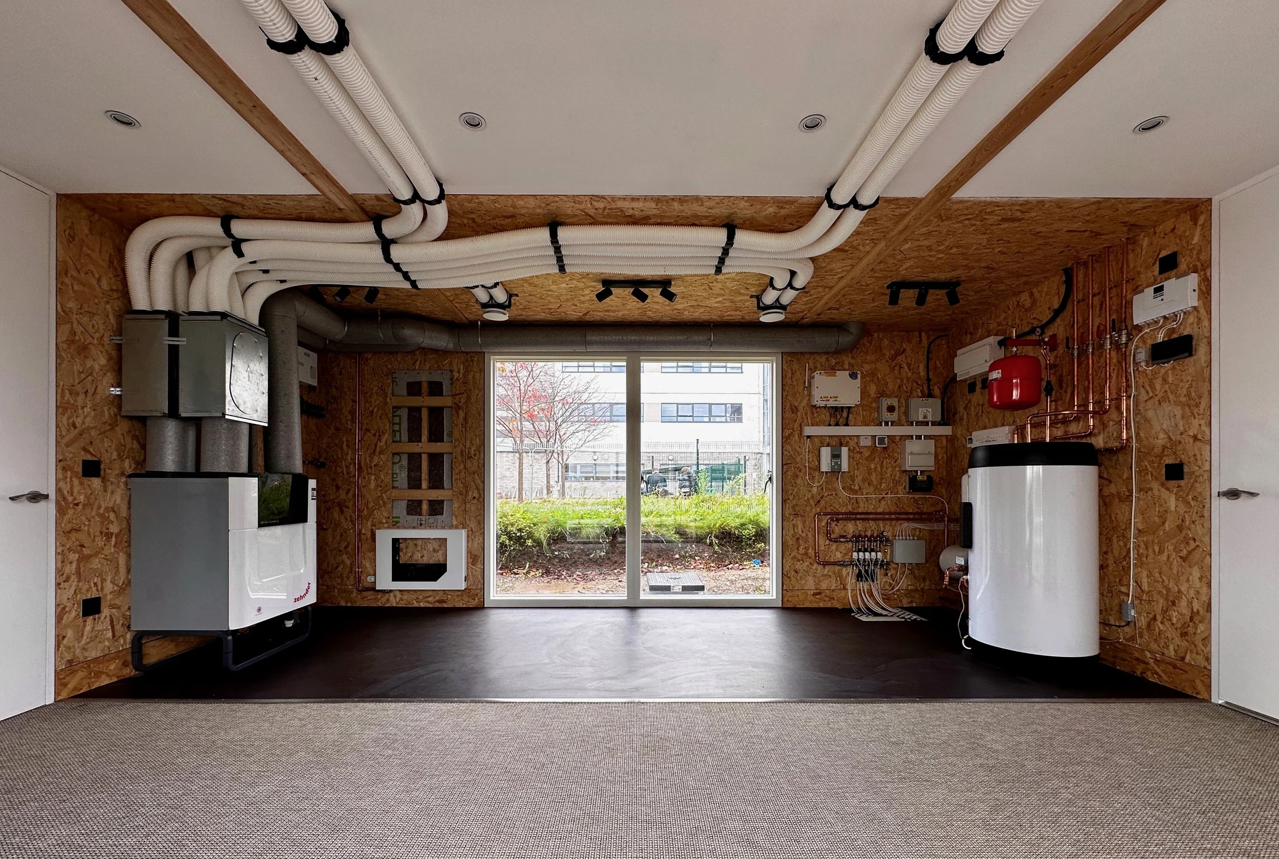 In addition to a conventional looking kitchen-diner and living room, there is a display area (pictured) where we’ve crammed in as many different zero-carbon systems as we could. Upstairs is a classroom for 20 students.